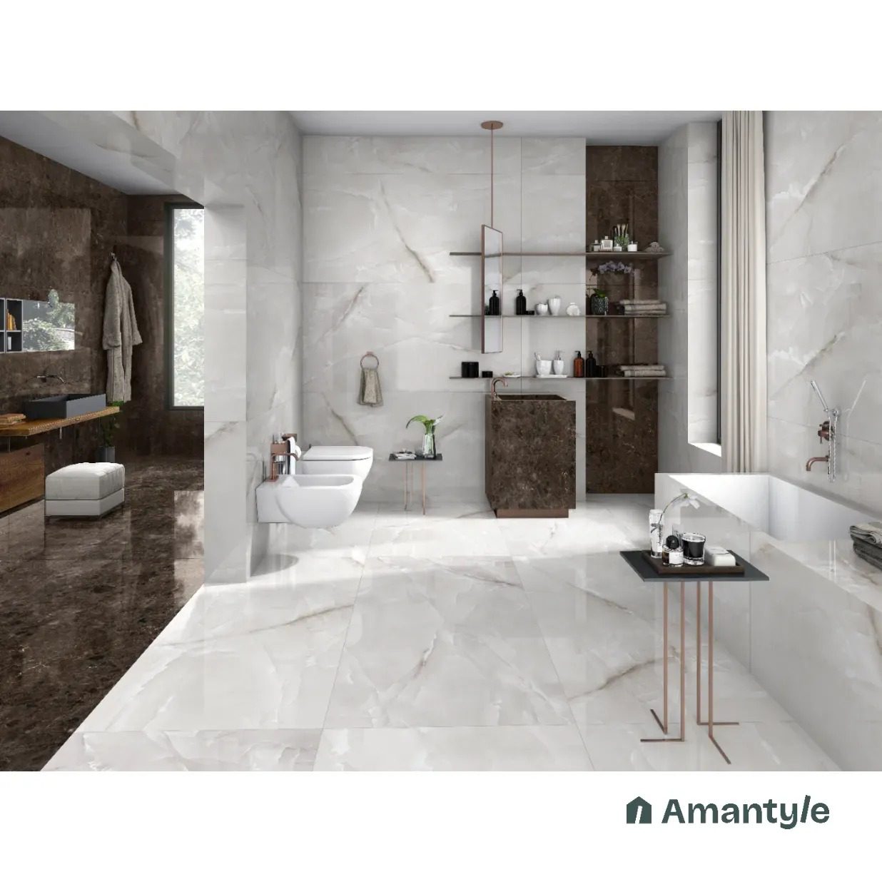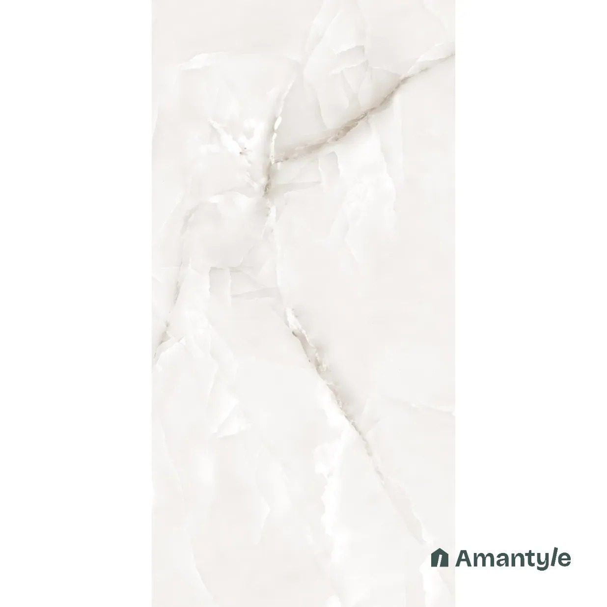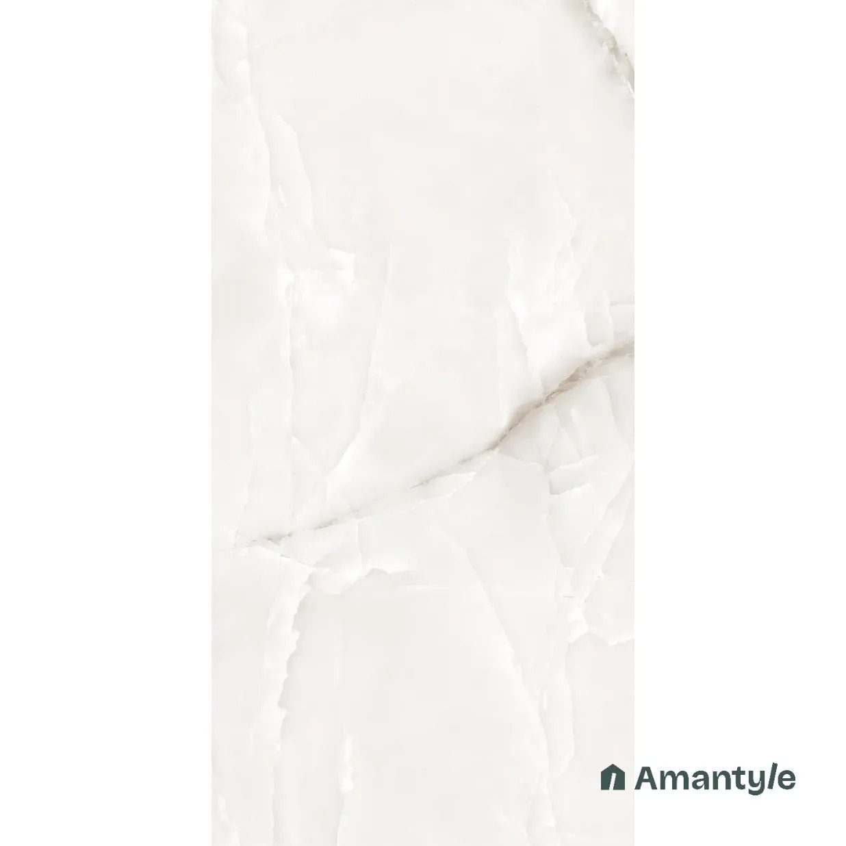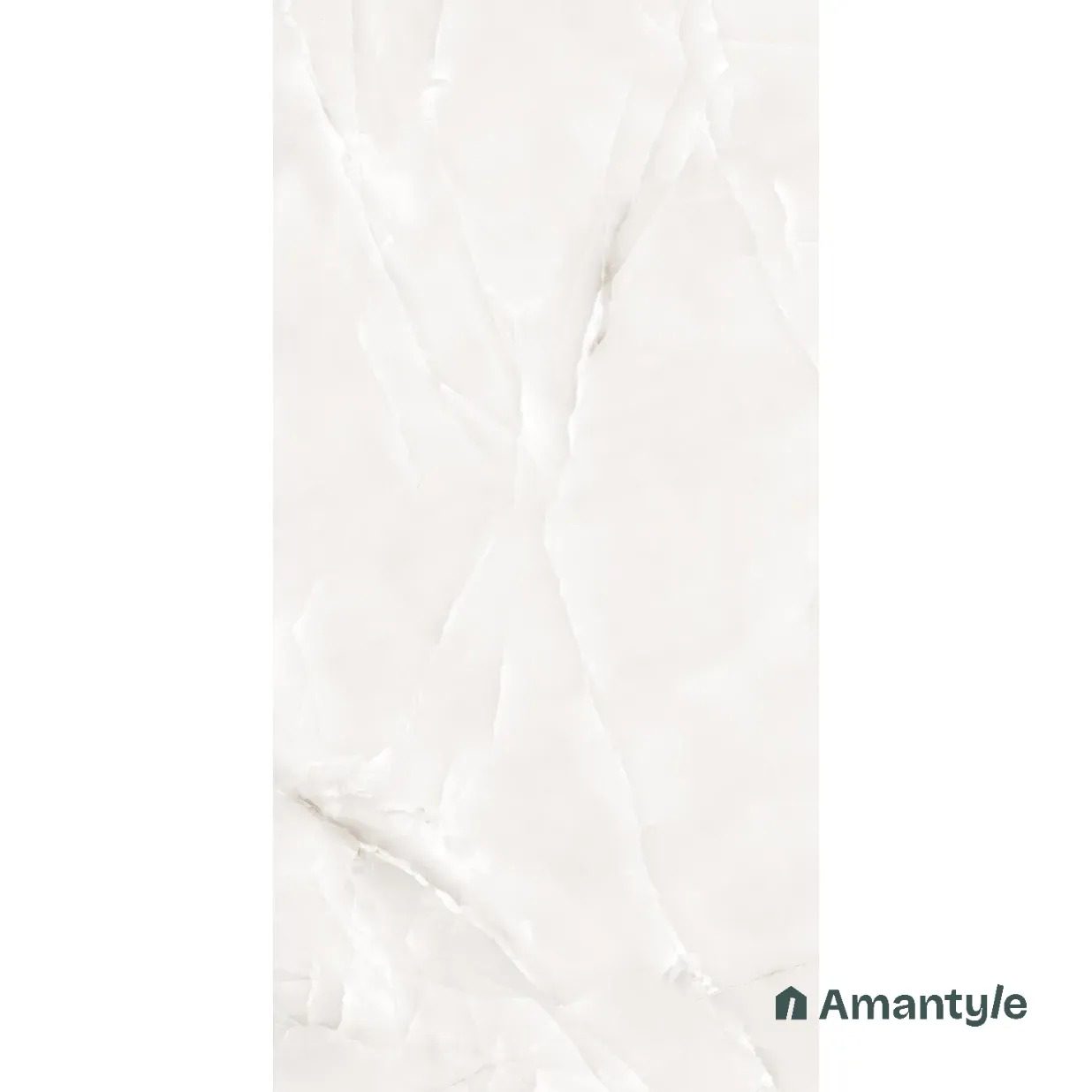 This marble look Slab tile showcases a pristine white base, elegantly accented with sleek white streaks and subtle grey tones. Its timeless design mirrors classic onyx marble look, making it a top-selling favorite in market. It comes in a radiant high-gloss finish, This vitrified tile offers both style and durability. As it has flexible body, it is Highly scartch resistant, stain-resistant, fire-resistant and easy to install.