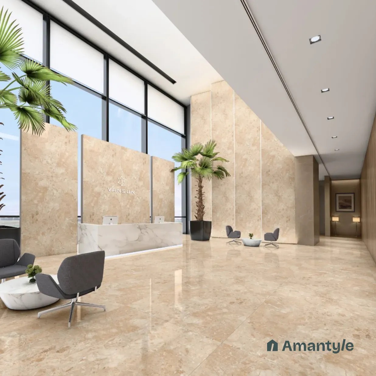 This Marble Slab tile features a rich beige base, beautifully enhanced with bold dark knots, soft brown grains, and delicate white veins. Its elegant design makes it a top-selling favorite in the market, and it comes in a radiant high-gloss finish. This vitrified tile offers both style and durability. As it has flexible body, it is Highly scratch-resistant, stain-resistant, fire-resistant, and easy to install.